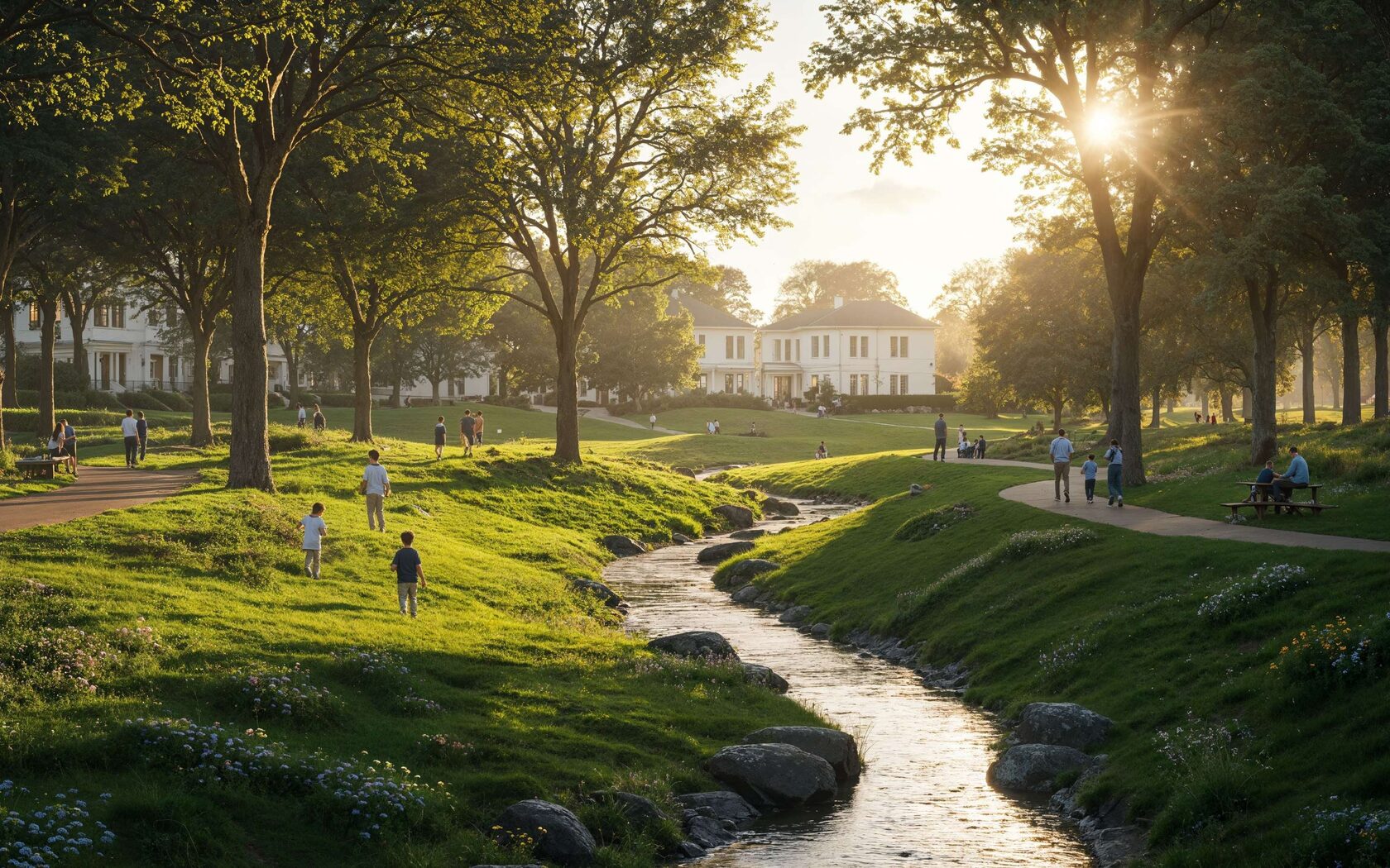 Представьте парк с мягкой зелёной травой и небольшим ручьём, между которыми гуляют дети с родителями.